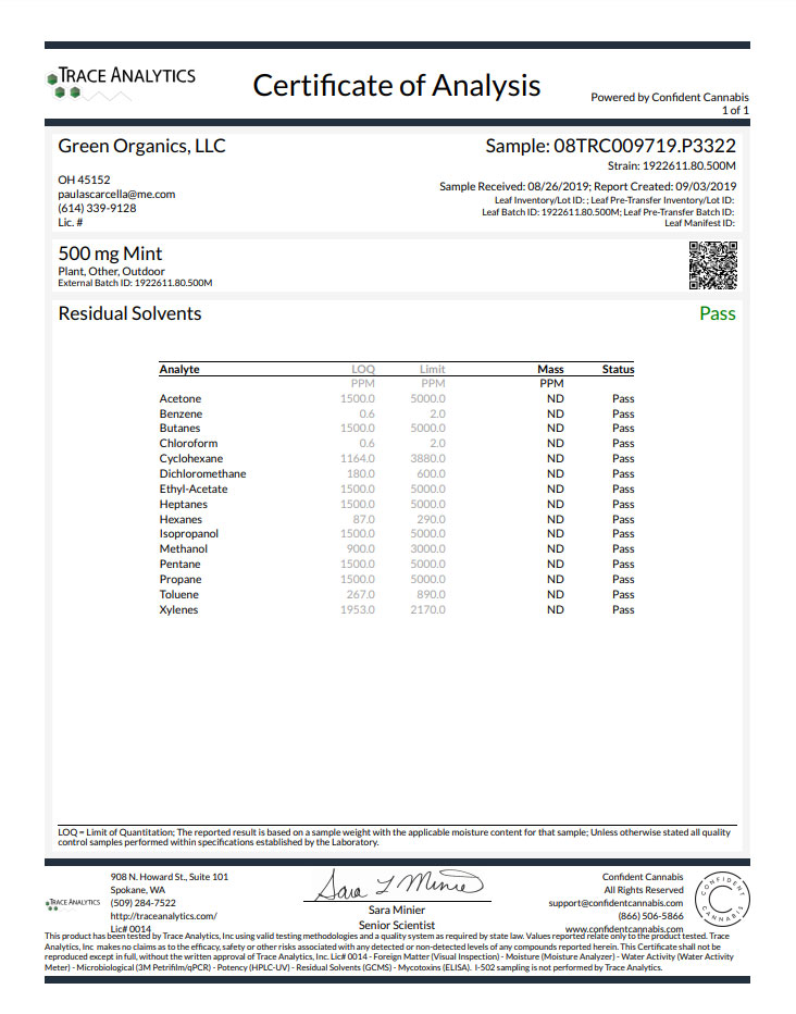 Third-party testing for 500mg Mint Lot #1922611.80.500M shows the total CBD contained in the 1-ounce (30mg) bottle is 684.60mg. Additionally, at 0.059% by weight, the THC level is well below the Federal Farm Bill level of 0.3%. Testing results show it to be 100% pure.