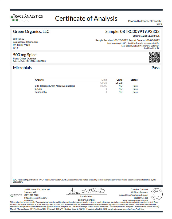 Third-party testing for 500mg Spice Lot #1922611.80.500S shows the total CBD contained in the 1-ounce (30mg) bottle is 650.40mg. Additionally, at 0.055% by weight, the THC level is well below the Federal Farm Bill level of 0.3%. Testing results show it to be 100% pure.