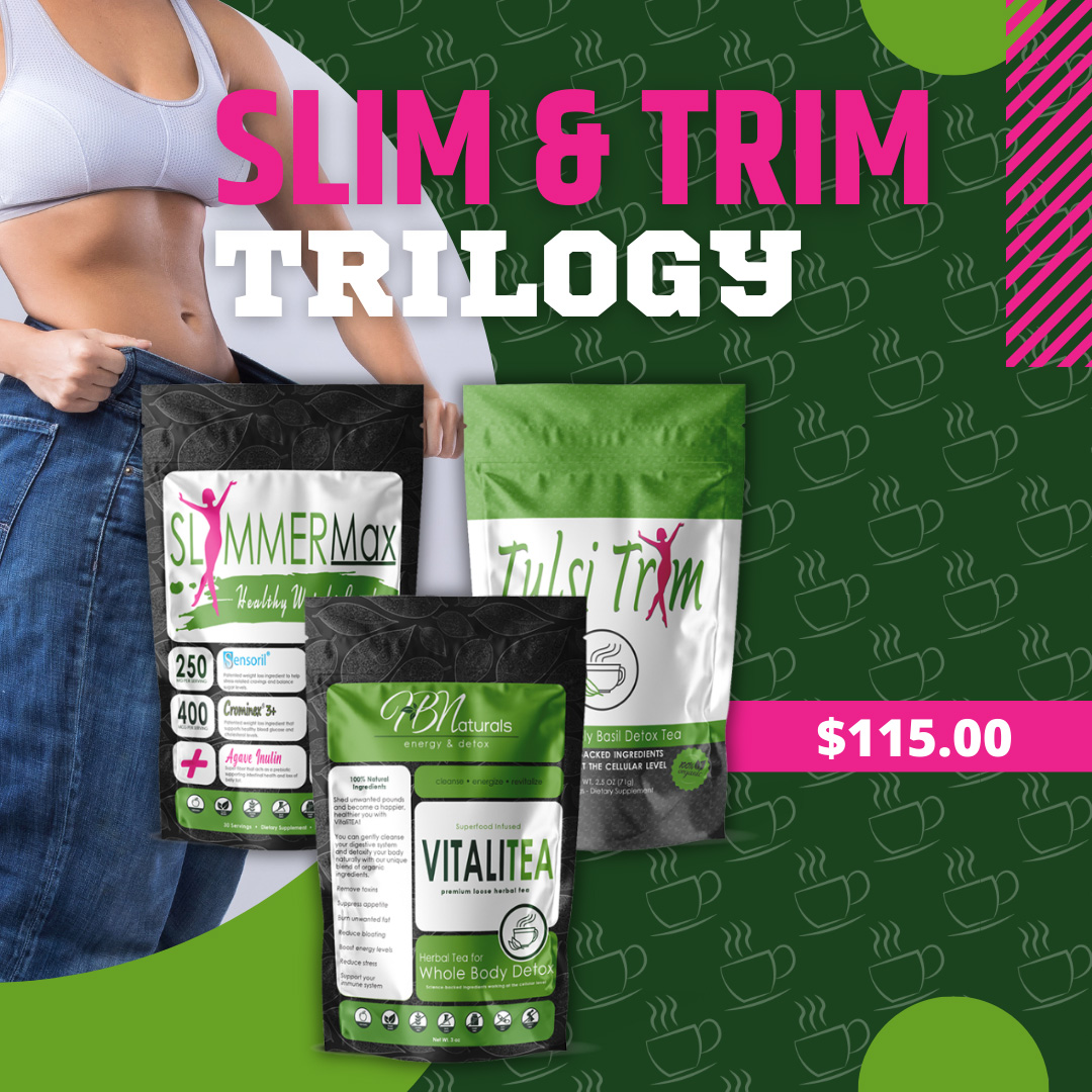 The Slim & Trim Trilogy is a powerful pack featuring Tulsi Trim, Slimmer Max, and VitaliTea, designed to support detoxification, weight management, and overall wellness. This synergistic combination helps cleanse the body, boost metabolism, reduce cravings, and promote balanced digestion, giving you the tools to feel lighter, more energized, and in control of your health.*