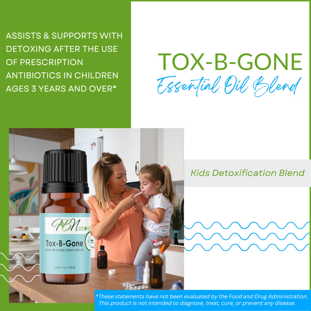 Tox-B-Gone is a proprietary blend of essential oils that have been shown to assist and support the body with detoxing following the use of prescription antibiotics in children ages 3 years and over.*